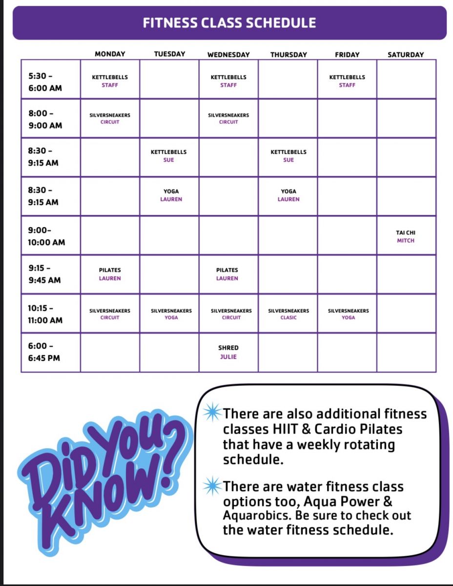 For descriptions of all classes and fitness pass prices, see our Fitness Class Descriptions.